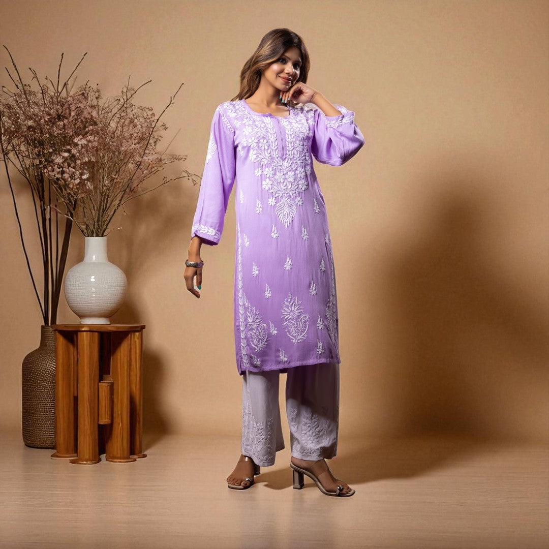 The Amira: Handcrafted Rayon Satin Long Kurti with Chikankari|Lilac