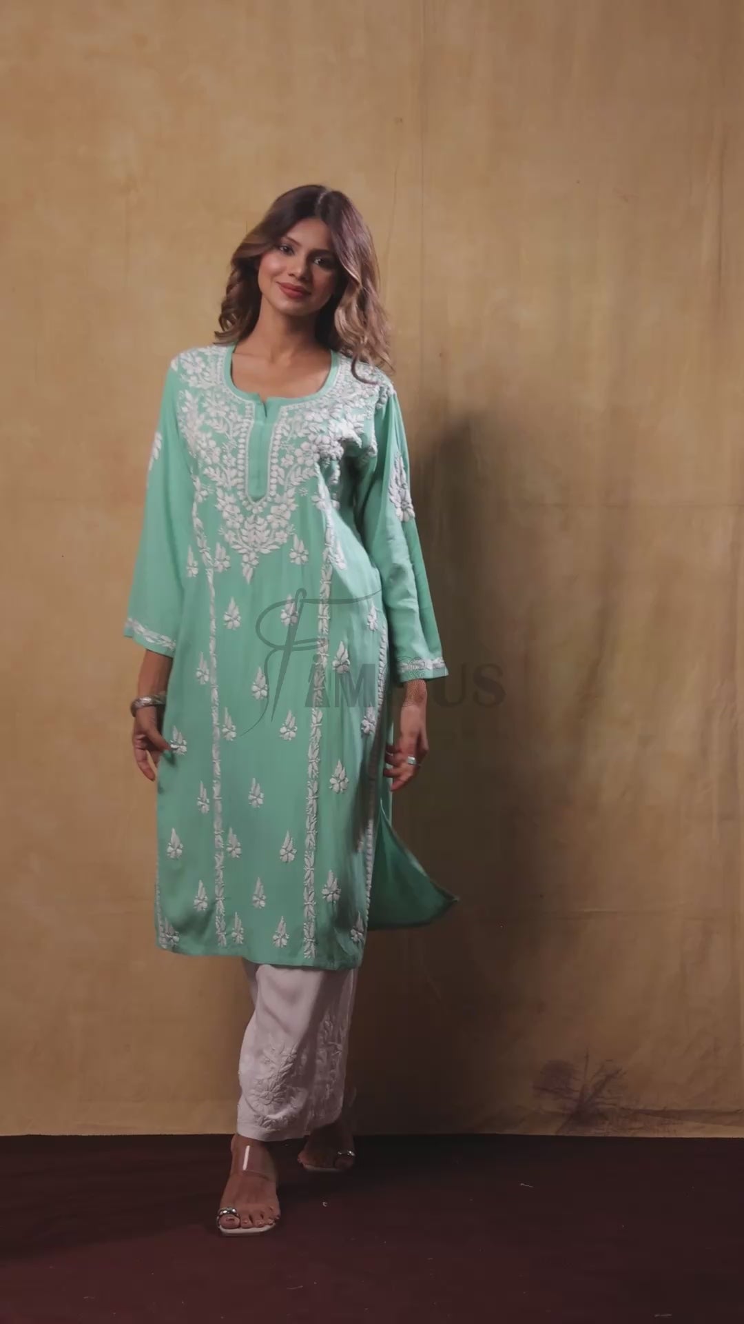 The Amira: Handcrafted Rayon Satin Long Kurti with Chikankari|Light Green