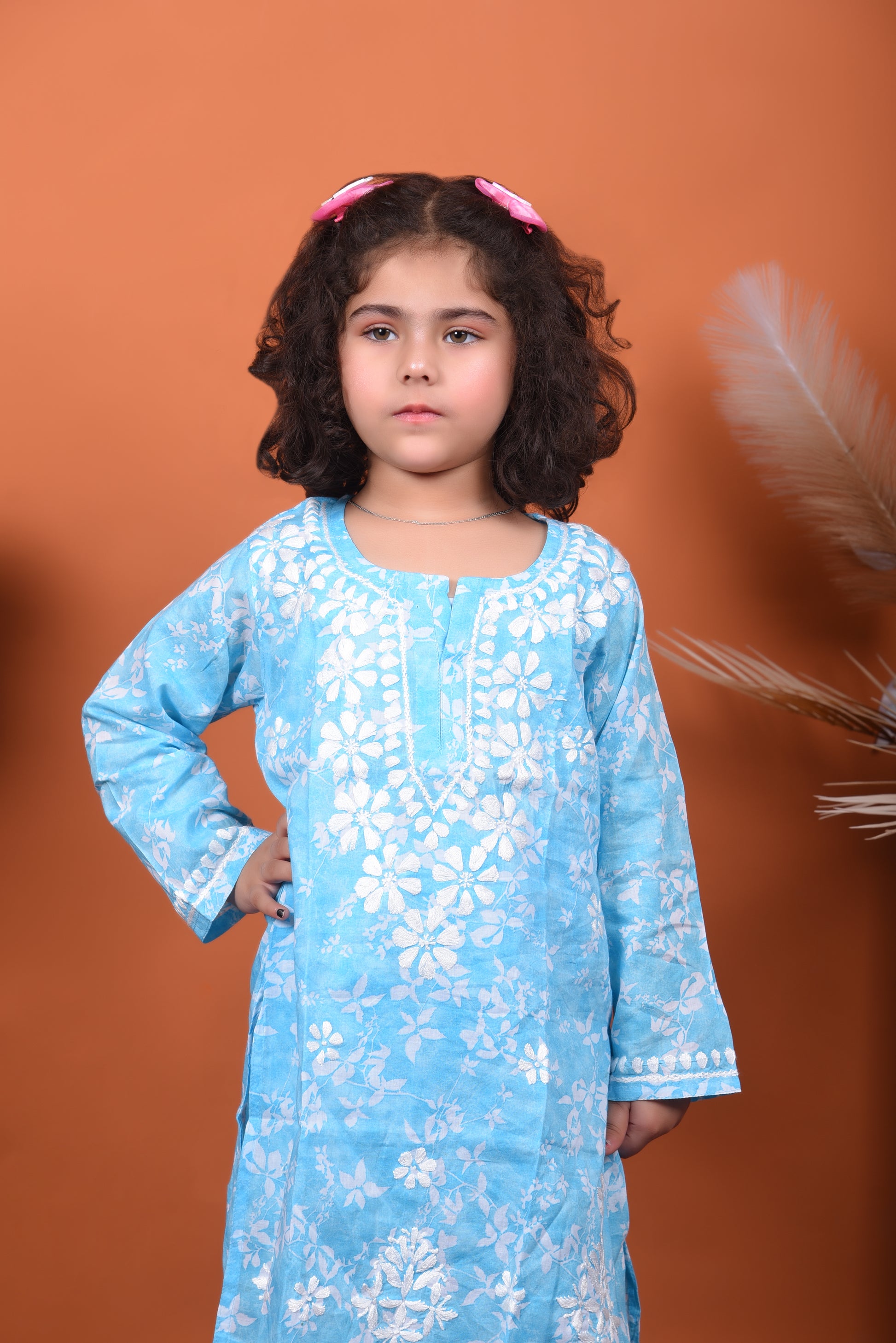 This Little Angel's Dream set features a soft blue mulmul fabric kurti and plazo, tailored for girls aged 1 to 13 years. The kurti showcases delicate chikankari embroidery, a round neck, and full sleeves, offering both elegance and comfort. Lightweight and breathable, this ensemble ensures ease of movement while reflecting traditional craftsmanship. Perfect for special occasions or daily wear, it blends classic style with gentle fabric ideal for young, sensitive skin.