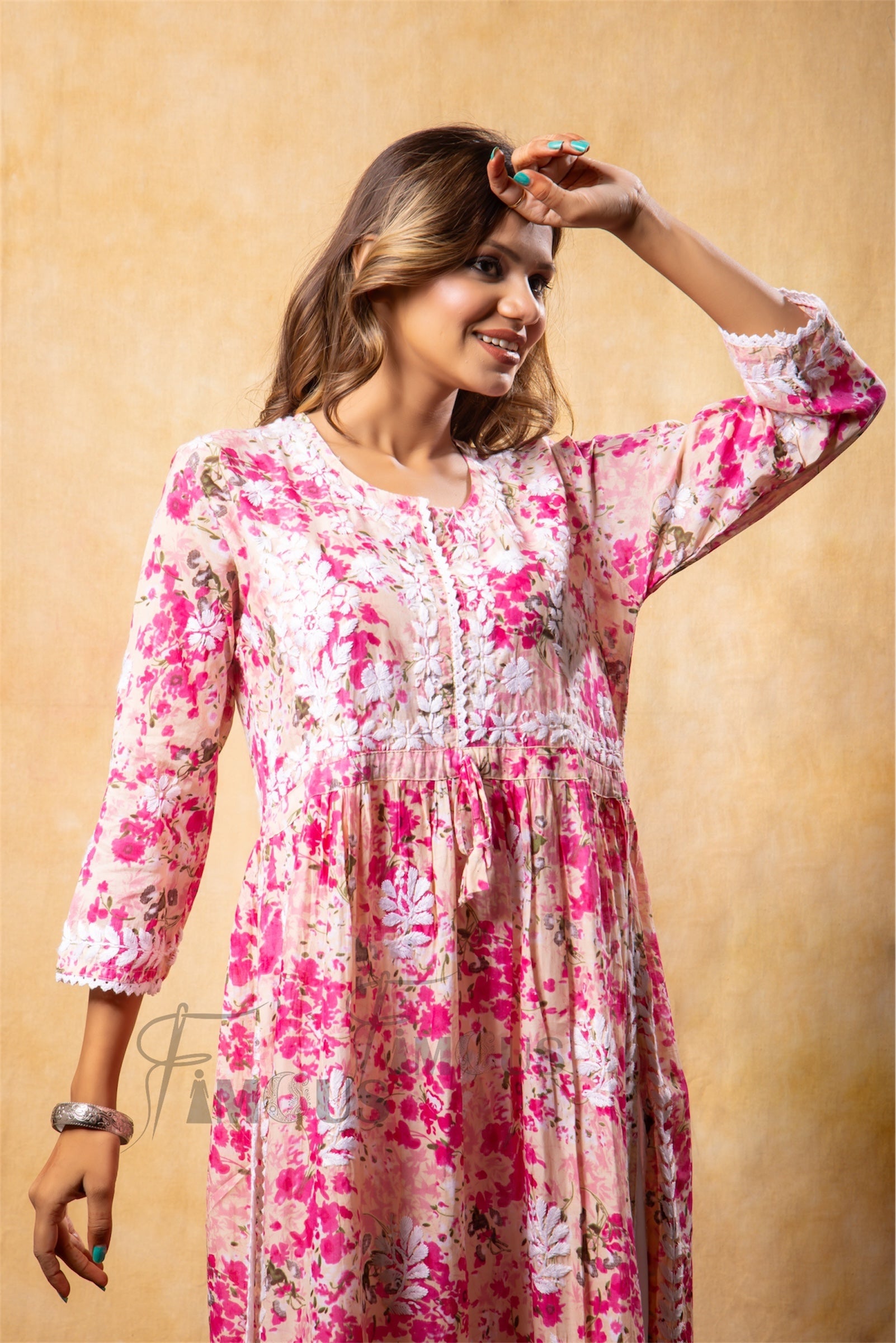 The Samira: Floral Mulmul Chikankari Kurti with Lace Accent|Pink
