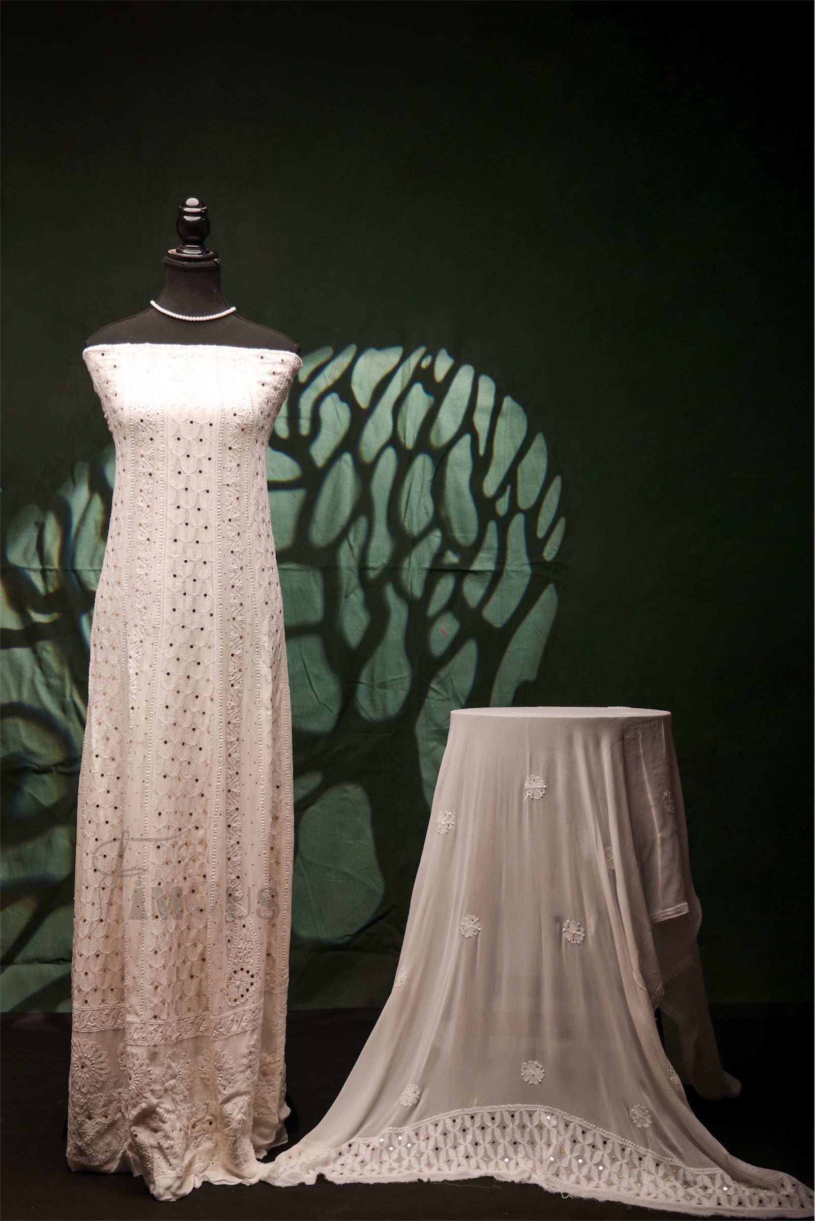 - Embroidery: Intricate Chikankari embellished with heavy pearls, katdana, sequins, and Resham work.