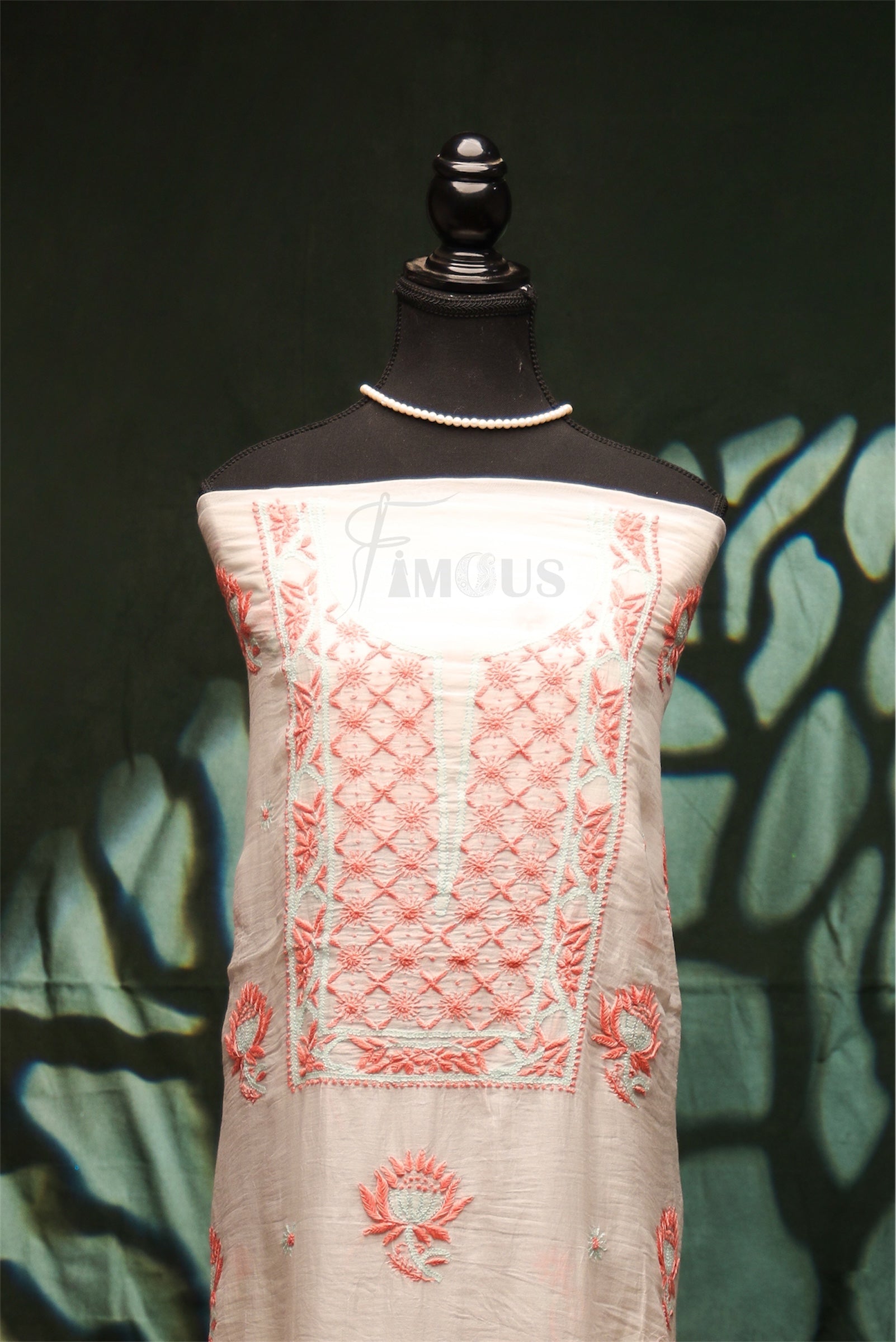 Zunaira Mul Chanderi – Unstitched White & Pastel Chikankari Kurta Dupatta Set